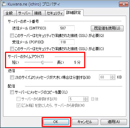 「詳細設定」タブを選択し、「サーバーのタイムアウト」を「5分」に変更します。