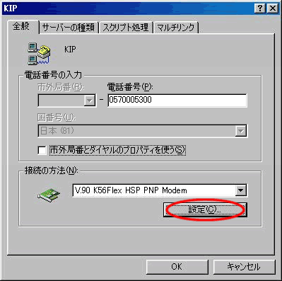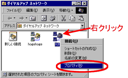 「ダイヤルアップネットワーク」のKIPへの接続アイコンを右クリックし、「プロパティ」を選択します。