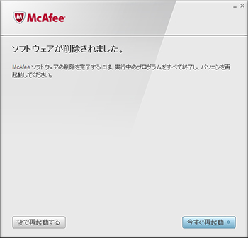 5. 削除が完了すると以下のような画面が表示されます。削除の処理を完了するにはコンピューターの再起動が必要になります。準備ができましたら[再起動]ボタンをクリックしてコンピューターを再起動してください。[閉じる]を押すと再起動せずに終了 できますが、後ほど必ず再起動を実施してください。