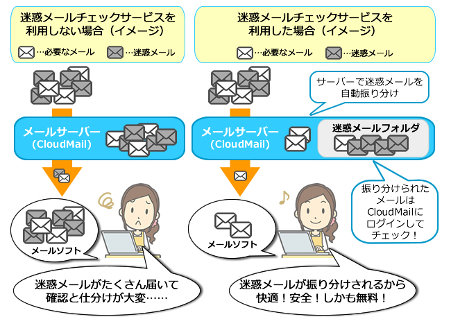迷惑メールチェックサービスとは、メールサーバー上でメールを1つ1つチェックし、迷惑メールと判定したメールをメールサーバー内にある迷惑メールフォルダに自動で振り分ける無料のサービスです。