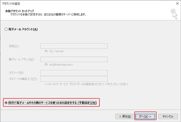 4.[自分で電子メールやその他のサービスを使うための設定をする(手動設定)]にチェックを入れ、[次へ]をクリックします。