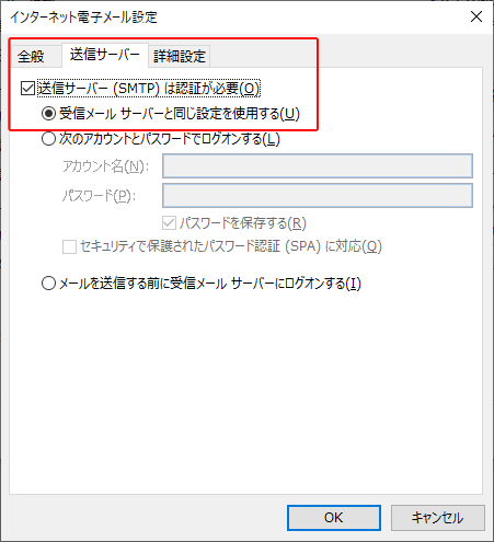 | 受信メールサーバーと同じ設定を使用する | チェックを入れる |