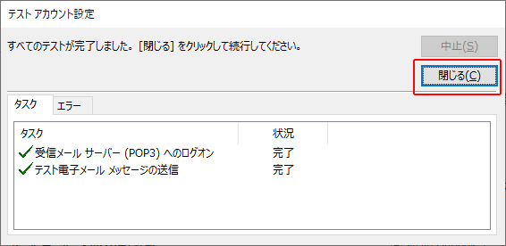 10.メールの送受信チェックが開始されます。終了後に[閉じる]をクリックします。