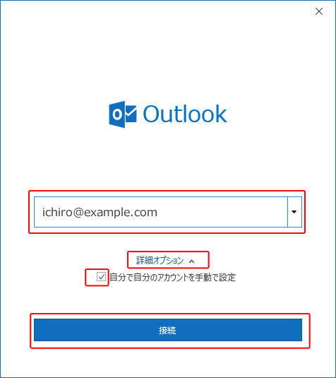 2.メールアドレスを入力し、[詳細オプション]をクリック、[自分で自分のアカウントを手動で設定]にチェックを入れ、[接続]をクリックします。