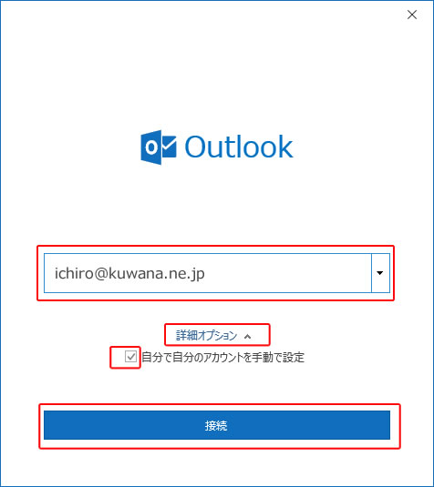 2.メールアドレスを入力し、[詳細オプション]をクリック、[自分で自分のアカウントを手動で設定]にチェックを入れ、[接続]をクリックします。