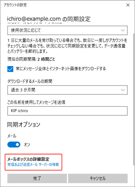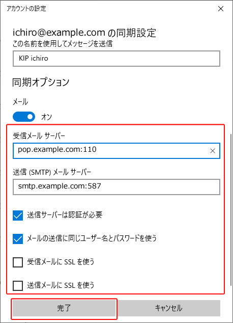 | 送信(SMTP)メールサーバー | smtp.ご利用のドメイン名:587 ※例えばメールアドレスがichiro@example.comなら smtp.example.com:587を入力する。 |