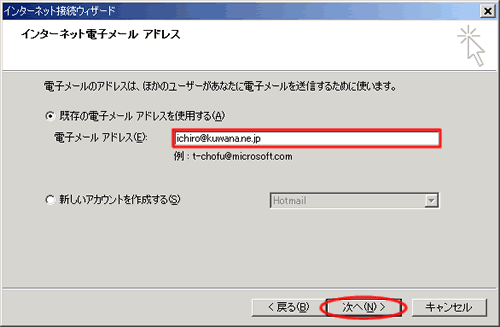 - 電子メールアドレス:お客様の電子メールアドレス(例:ichiro@kuwana.ne.jp)