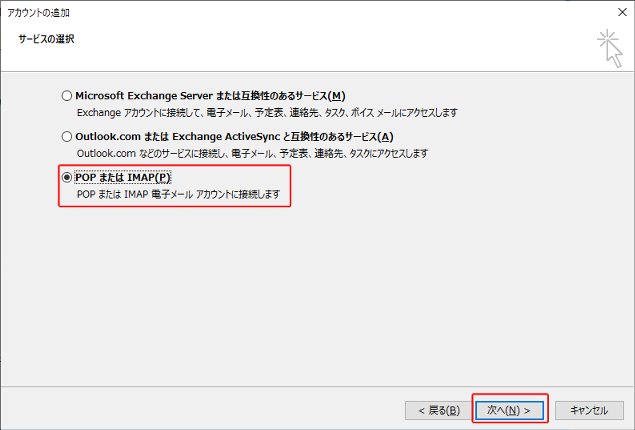 5.[POPまたはIMAP]にチェックを入れ、[次へ]をクリックします。